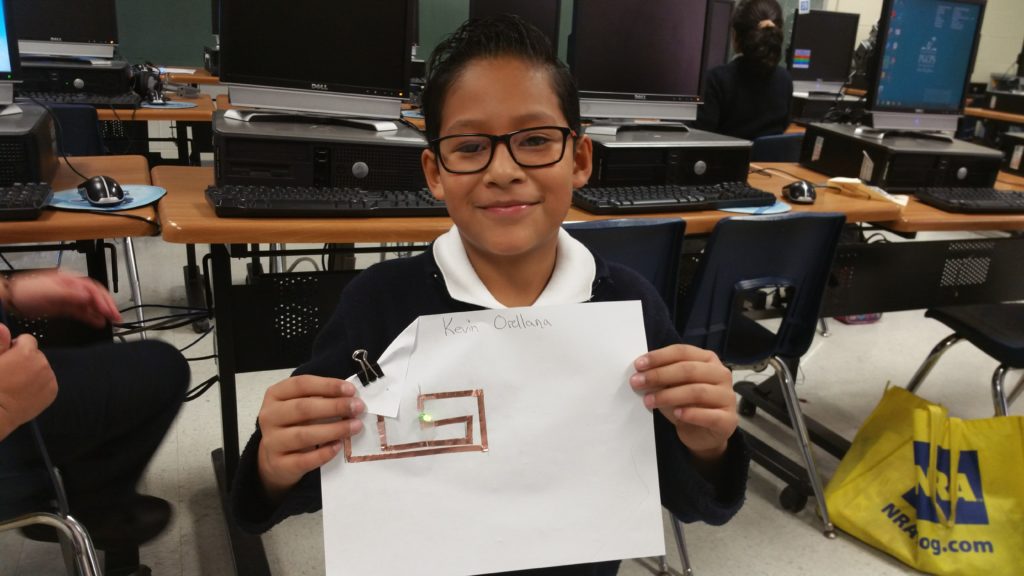 4th grader from James McHenry Elementary School designing his own simple circuit after learning from the Chibitronics Circuit Sticker Sketchbook. He designed it, determined how much of each material he needed, measured the copper tape, and built his own circuit.