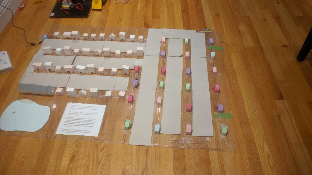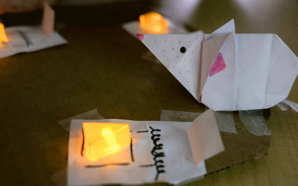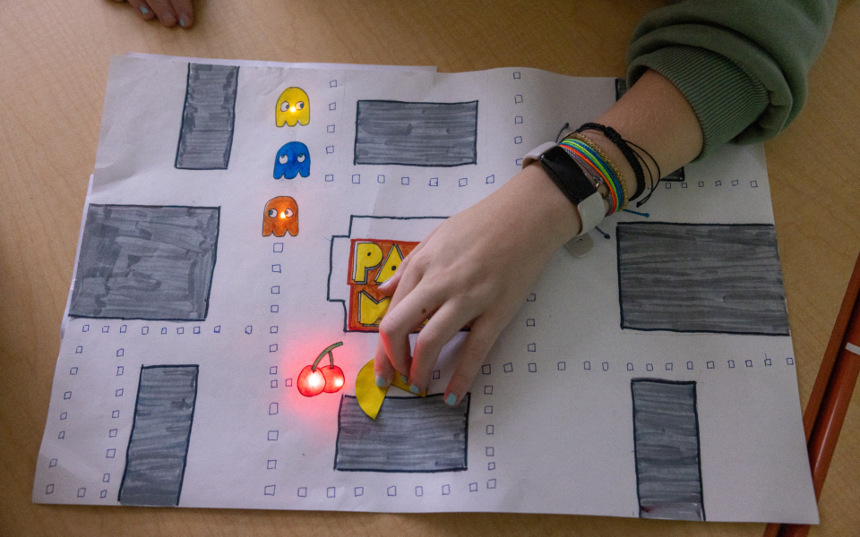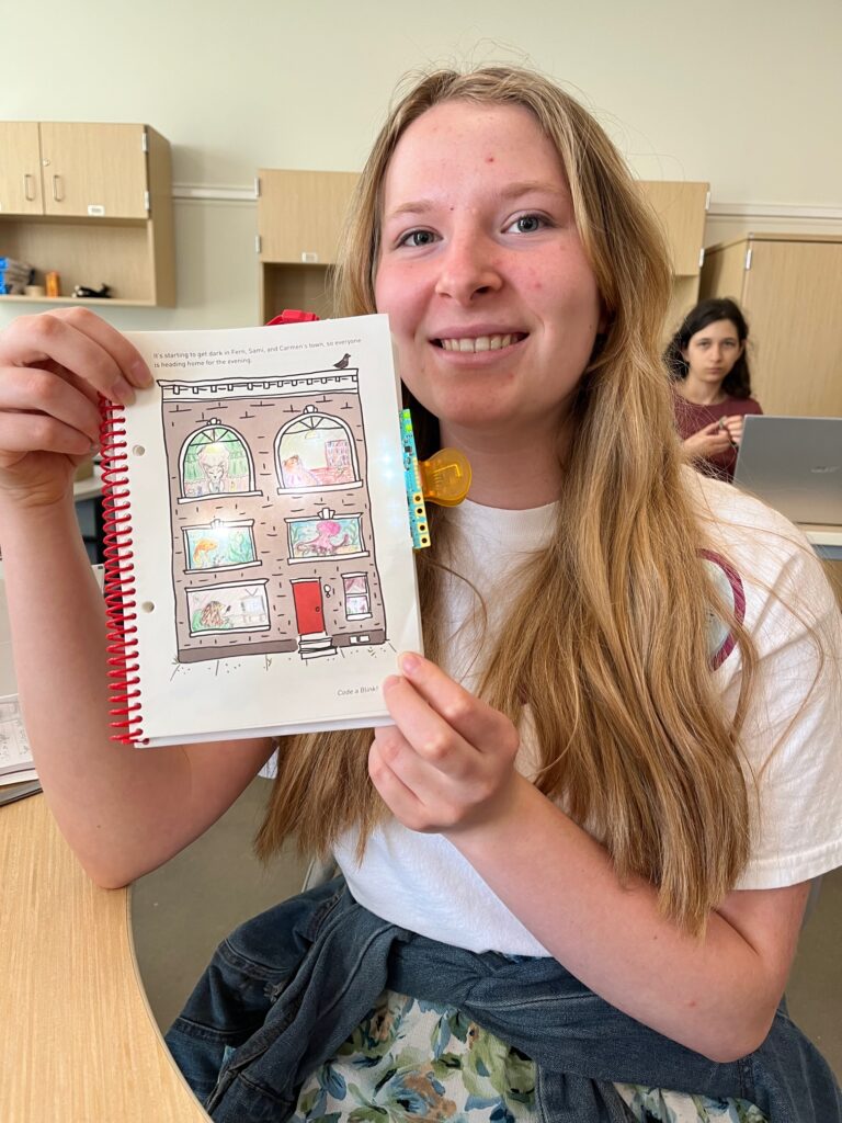 A fifth grader built this paper “smart” city by creating little paper houses and connecting them to a Chibi Chip using copper tape. She used Microsoft MakeCode to develop the code to light the city.