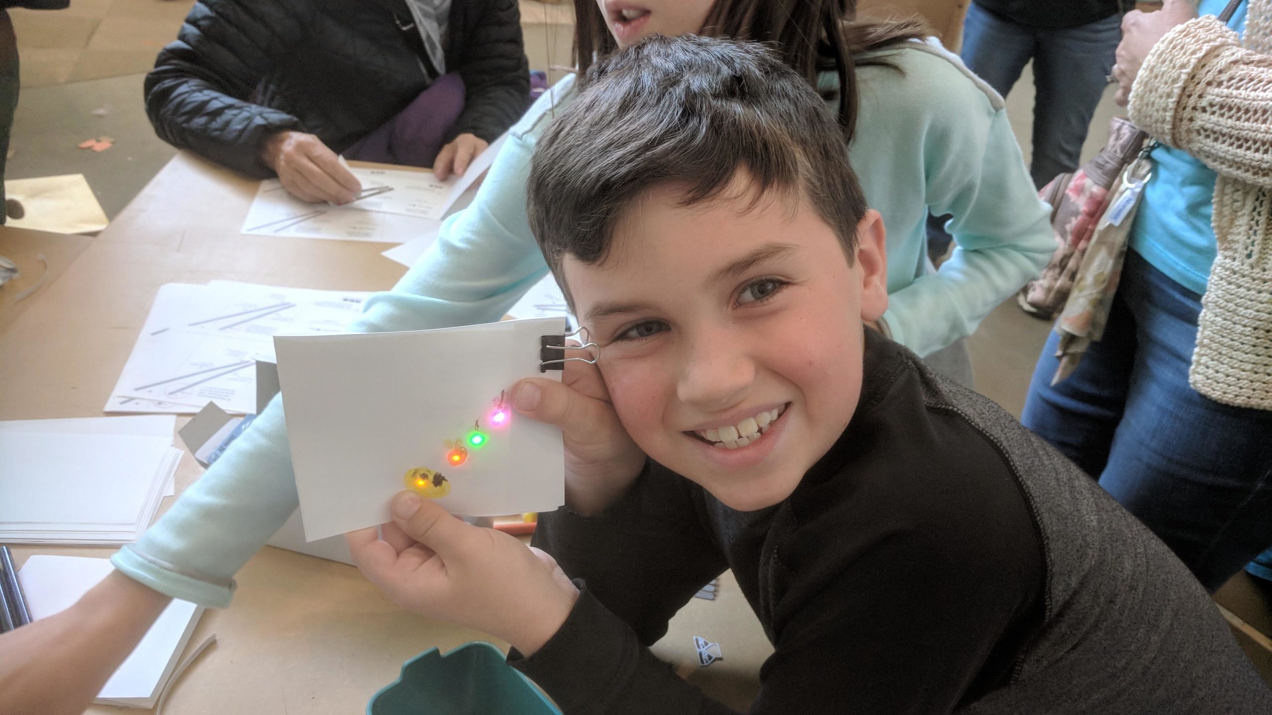Youngster visiting the Explora Kids Museum in Albuquerque, New Mexico. He couldn’t get enough circuitry! He even built and tested a Chibitronics illuminated helicopter.