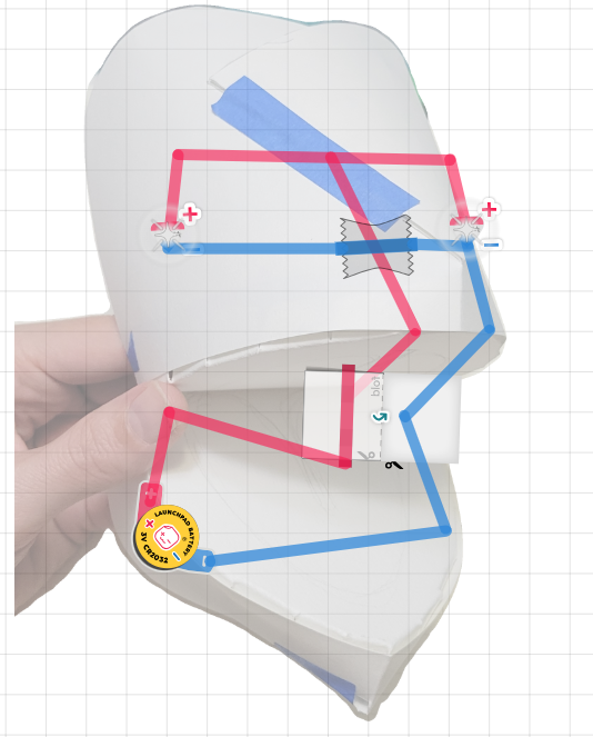 First, I have them pull out a βCut-and-Foldβ switch, Launchpad battery, and LED lights. The βCut-and-Foldβ switch operates as the βmouthβ and can only run positive or negative energy through it. It helps for students to click the fold closed [in the software] when applying the line connectors so [they] see the color passing through it. Then place the Launchpad battery, usually near the back of the jaw or else it may add too much weight when physically trying to talk with it. This step is important and may affect how the final puppet will need to be constructed to accommodate the form and circuit location (see note 2a below) (2 hours or about 2-3 Days).