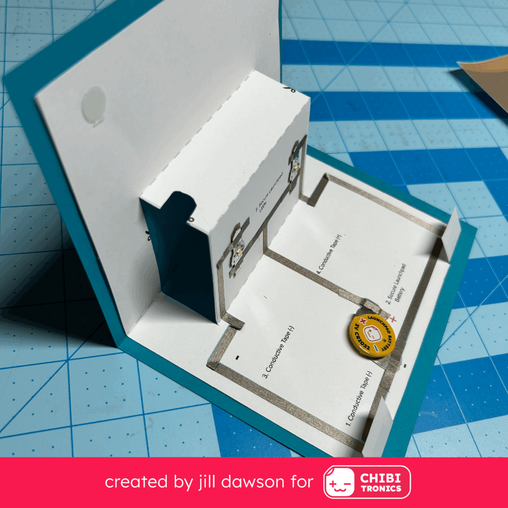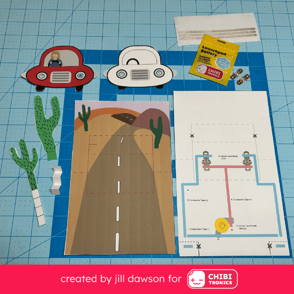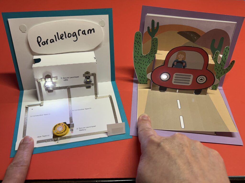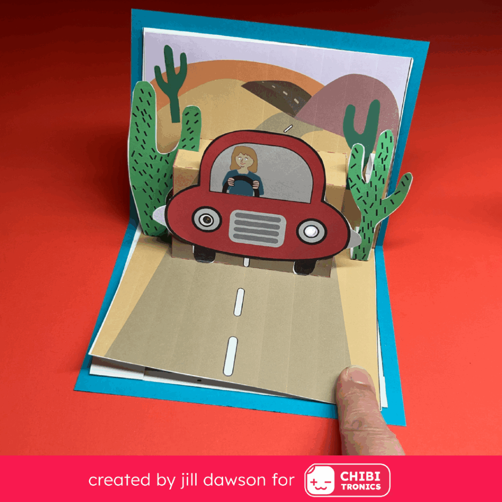 In the video I’ll show you the process that I use for cutting, scoring, and assembling the mechanism and adding an interactive circuit behind a desert scene. My hope is that it will help you get started with your own light-up pop-up designs.