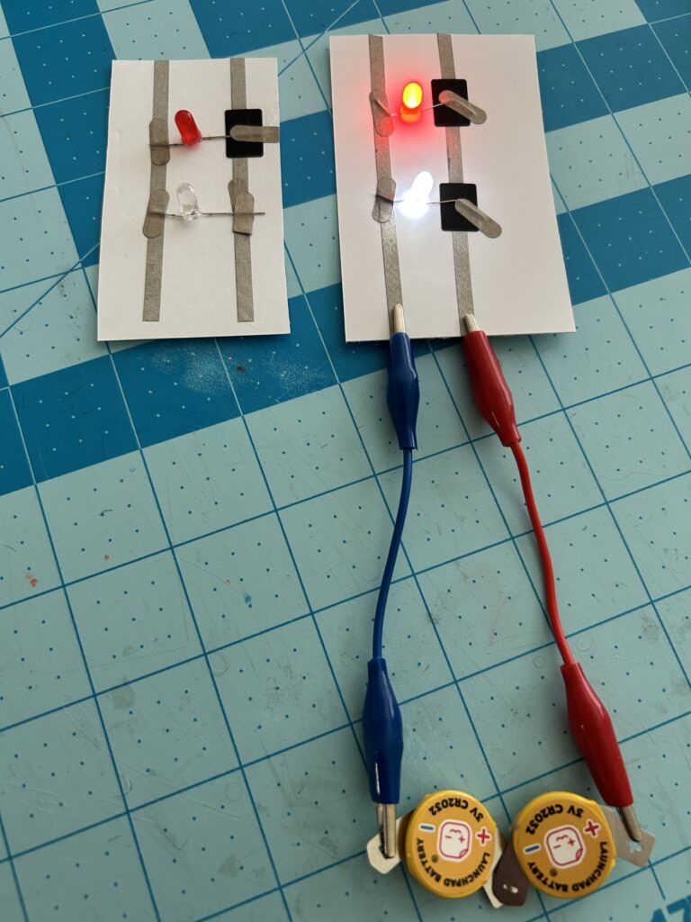 It is also possible to demonstrate the concept of how switches work with a pair of Launchpad Batteries and alligator clips. By leaving the overlapped wings loose, free from conductive tape (see images below), they may be easily separated to open the circuit and turn it off. Then, to close the circuit, to turn it back on, they may be brought back into contact with one another.